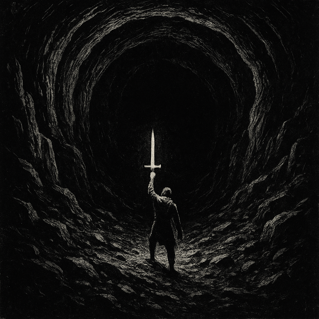 The descent becomes literal. This is the belly of the whale, the cave of initiation, the grave where the false self begins to die. Men carry their swords into the dark not to fight, but to illuminate what’s been buried. Together we name the addictions, patterns, and lies that live in our shadows. This is the blackening — the beginning of the Great Work.
